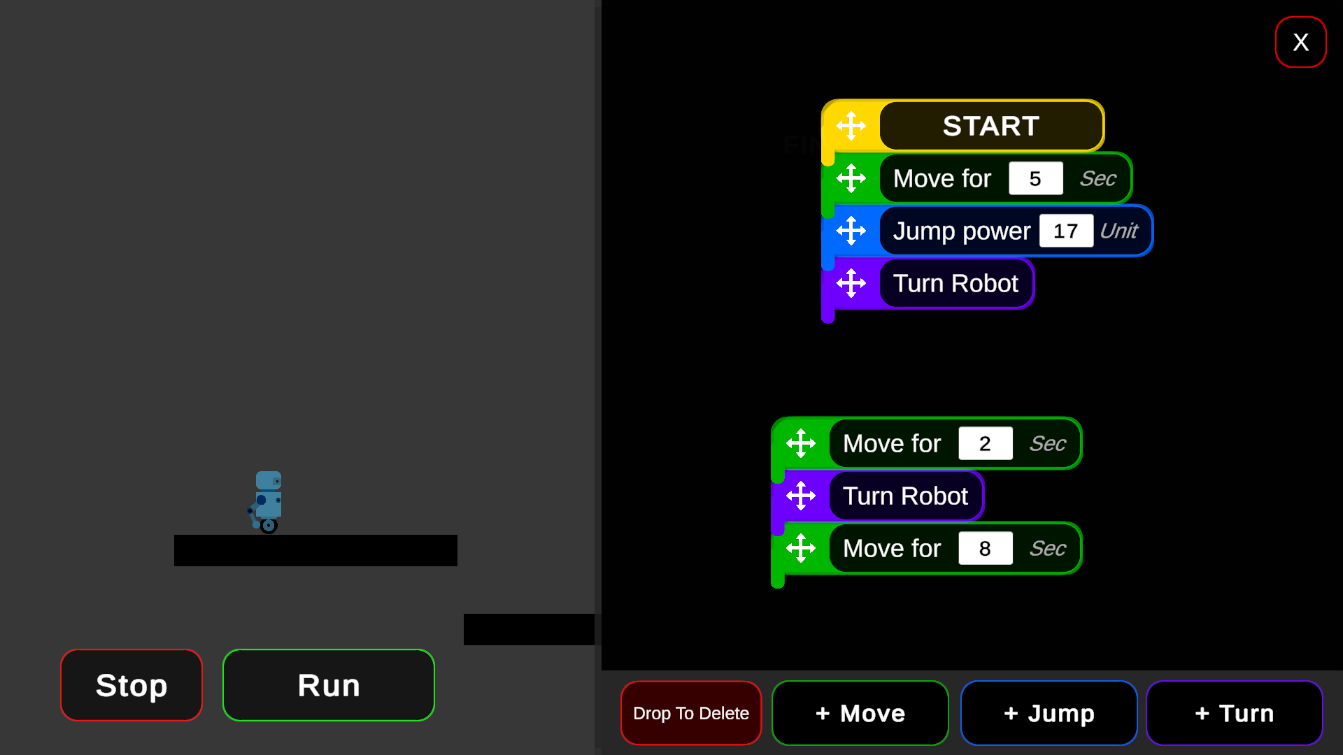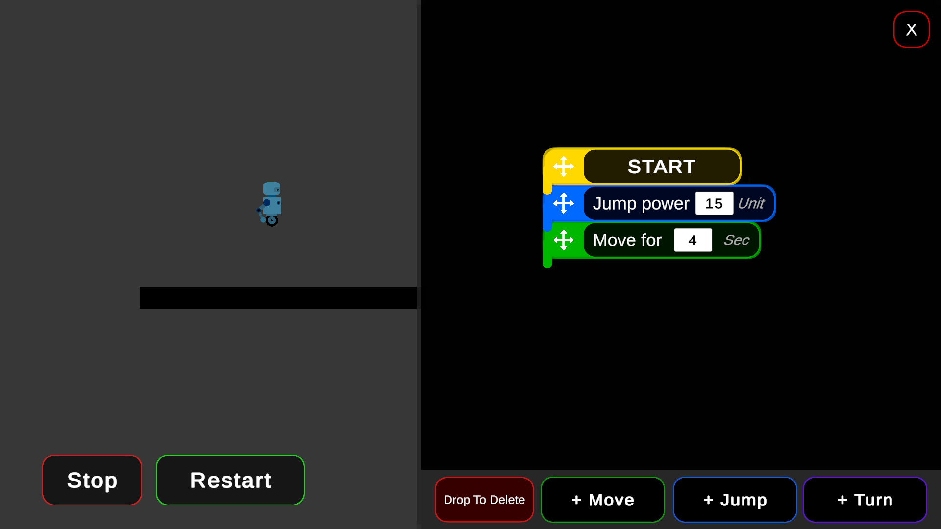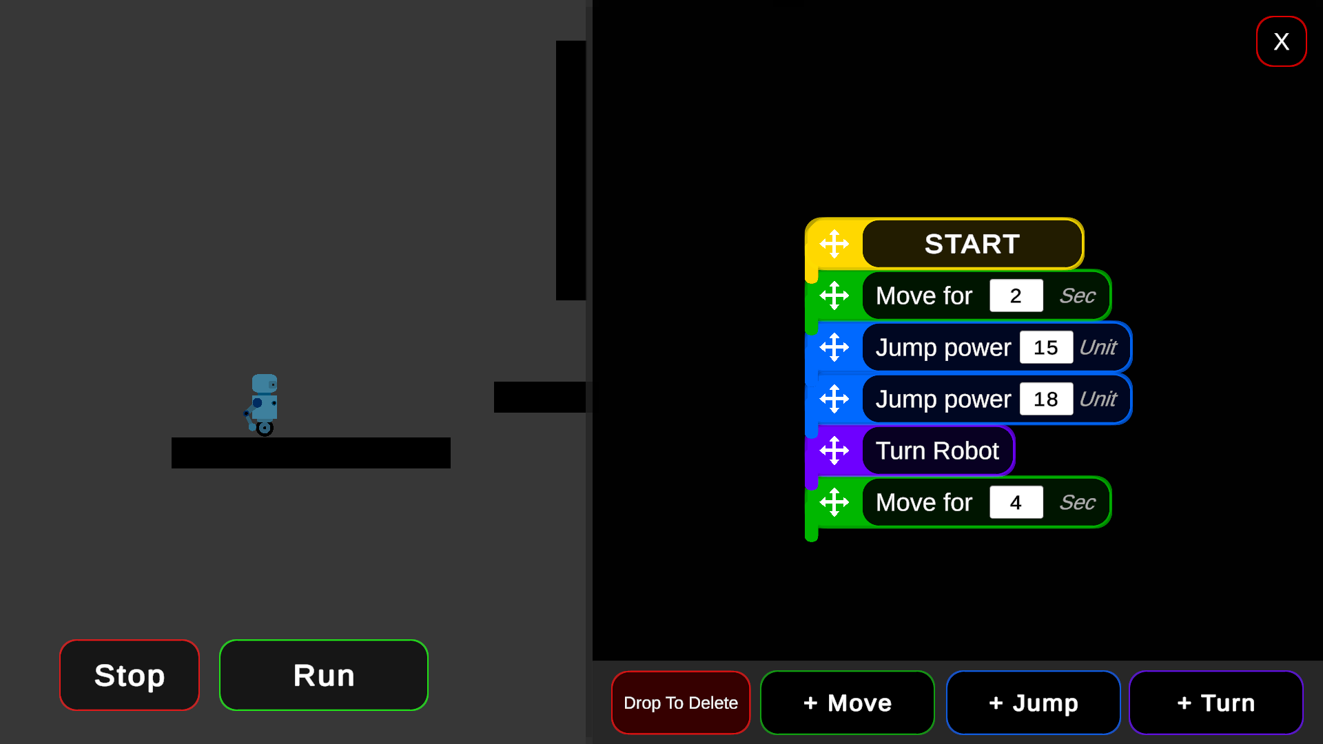 Arrange visual command snippets like “Move”, “Jump”, and “Turn” to guide your robot through each level.