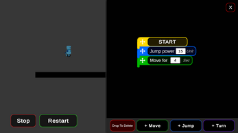 Open the Code Panel (Open by Default, Refer Screenshots) and drag snippets (Move, Jump, Turn) to form a sequence.